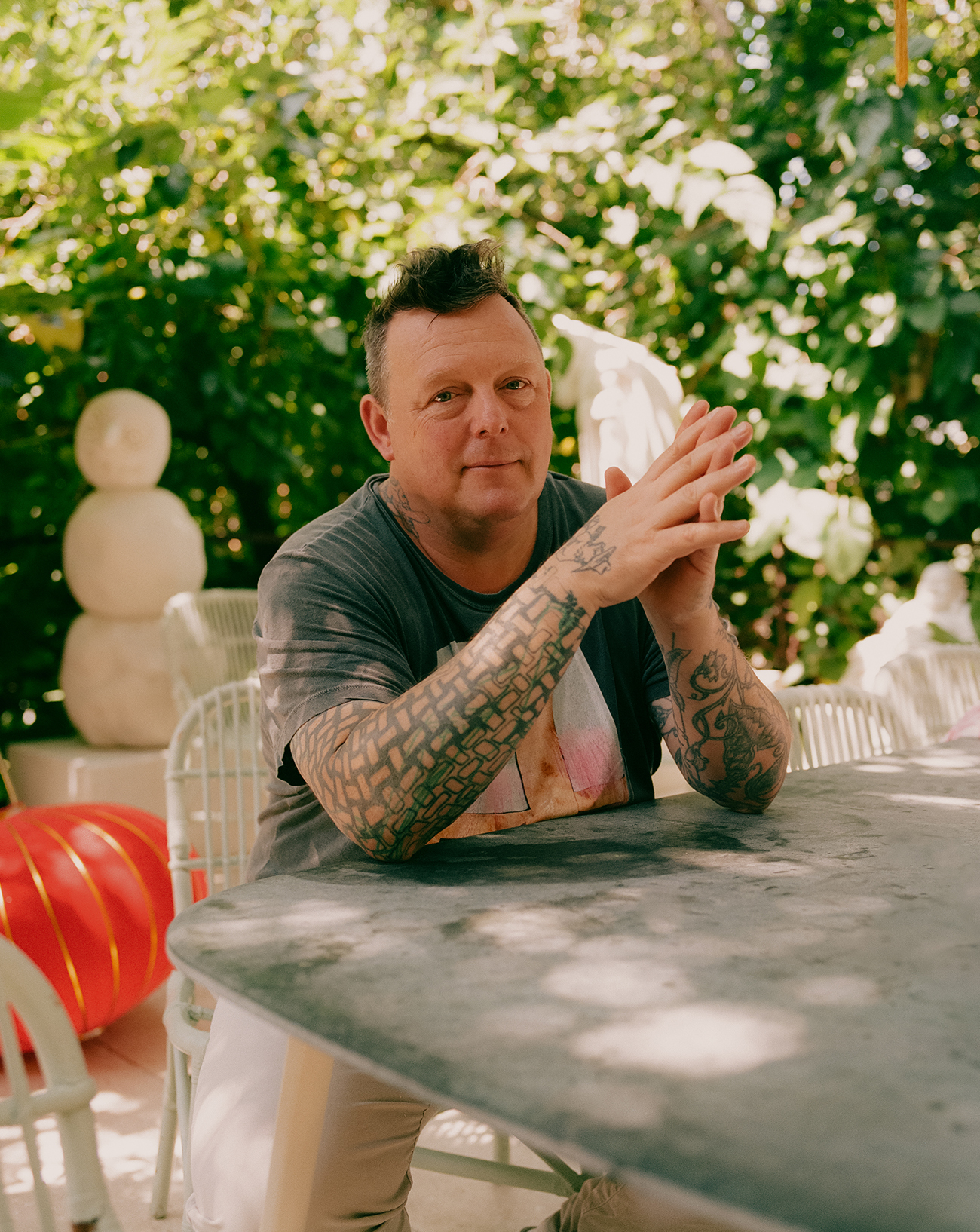 On a recent August morning in Los Angeles, I stumbled upon a stone-frozen snowman, as Urs Fischer, whose monumental sculpture Wave (2018) will be presented at Place Vendôme during Paris+ par Art Basel, led me into his sprawling domicile with an offering of coffee and a tour of the gardens. His steep garden is thick with cacti, along with huge marble statues of gape-mouthed witches, contented Buddhas, plaintive cats, money frogs, foo dogs, and stone-frozen snowmen. The statues are part of Swiss artist Peter Regli’s ‘Reality Hacking’ series, which invaded the hillside when Fischer invited Regli, a longtime friend, to take over the space.