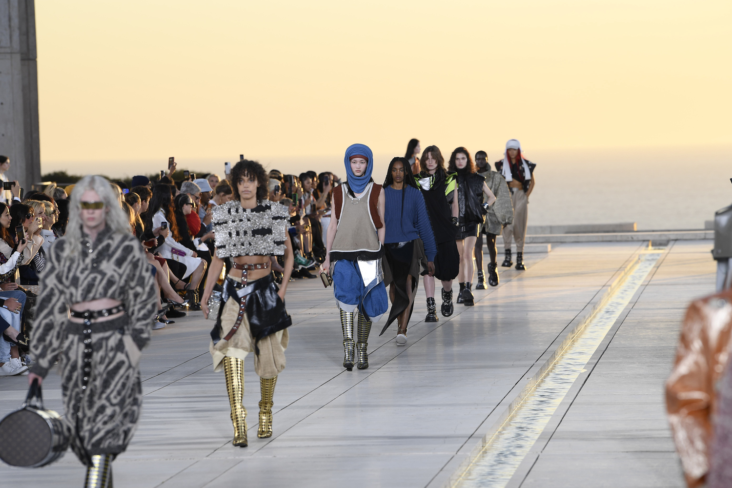 At the Salk Institute for Biological Studies in San Diego designed by architect Louis Kahn, Nicolas Guesquière offers a Louis Vuitton Cruise 2023 collection that unfolds earth-toned nomadic and flowing silhouettes.