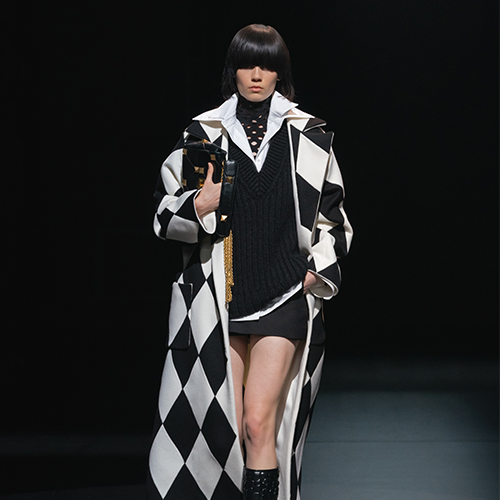 On the women’s side, most of the ensembles stop mid-thigh and reveal bare legs – a rather surprising choice given the season. The torsos were covered with loose-fitting white shirts, lace plastrons and jabots, and contrasting polka-dot tops, while pleated and flared high-waisted skirts, black mini-shorts, flat leather boots, coats and short woollen capes completed silhouettes that were strongly reminiscent of schoolgirl uniforms, while their materials and refinement gave them a more “grown-up” stature. For the men, Pierpaolo Piccioli created deceptively minimalist outfits that included ample coats, sometimes with large grey, black and white checks, knitted sweaters and wide-cut trousers, as well as short padded jackets and K-ways.