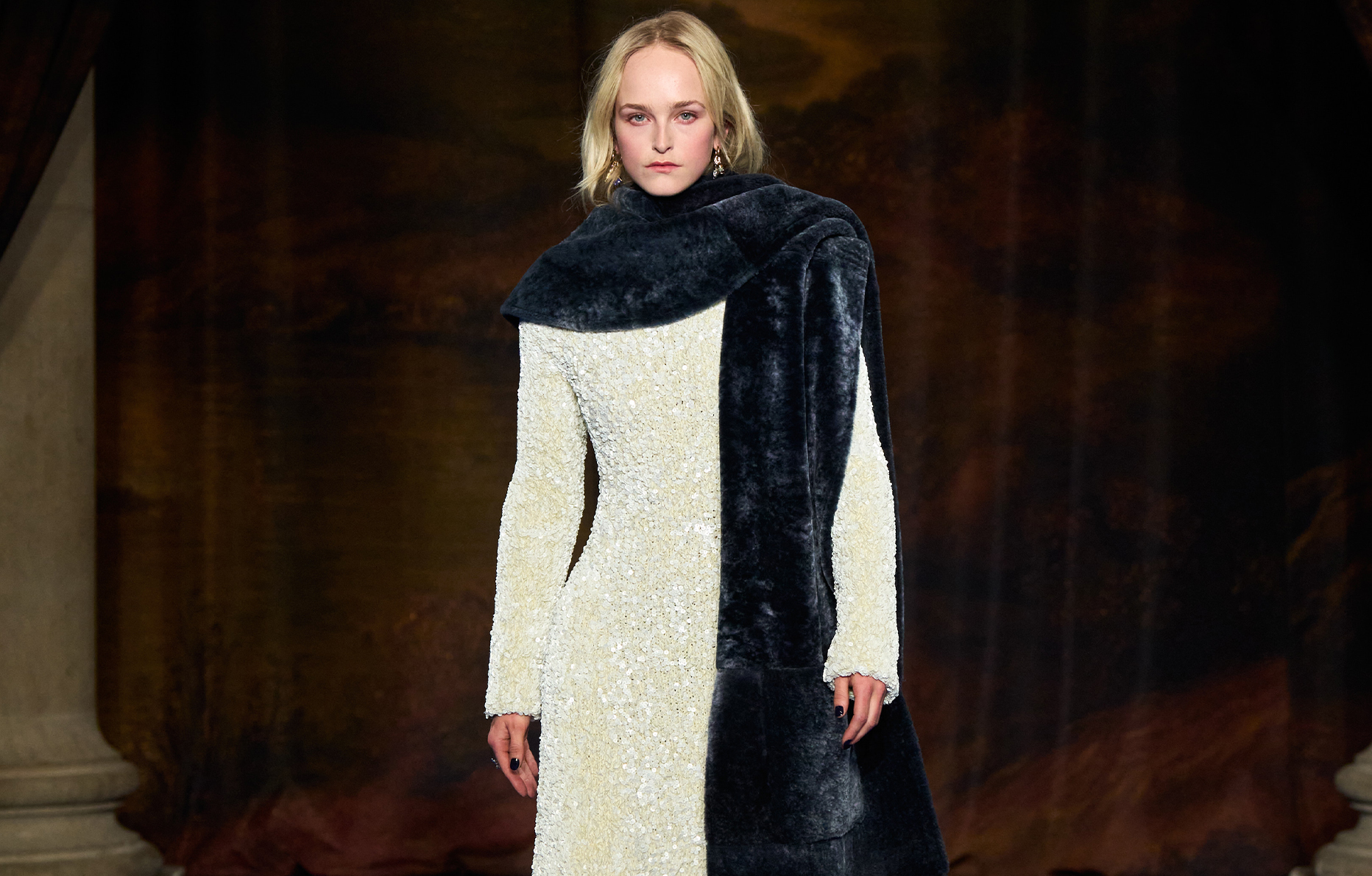 Mastering Burberry’s codes to perfection, Daniel Lee has crafted a wardrobe that transcends fleeting trends, carving out a contemporary and desirable identity that the brand had been lacking. This collection perfectly embodies that ethos, with its well-defined aesthetic—from a restrained color palette and sharp tailoring to its rich historical references. Fringe-adorned, sequined, or velvet dresses featured cinched waists or intricate textural details, complementing the coats, scarves, and accessories (umbrellas, bags) that continue to uphold Burberry’s legacy today.