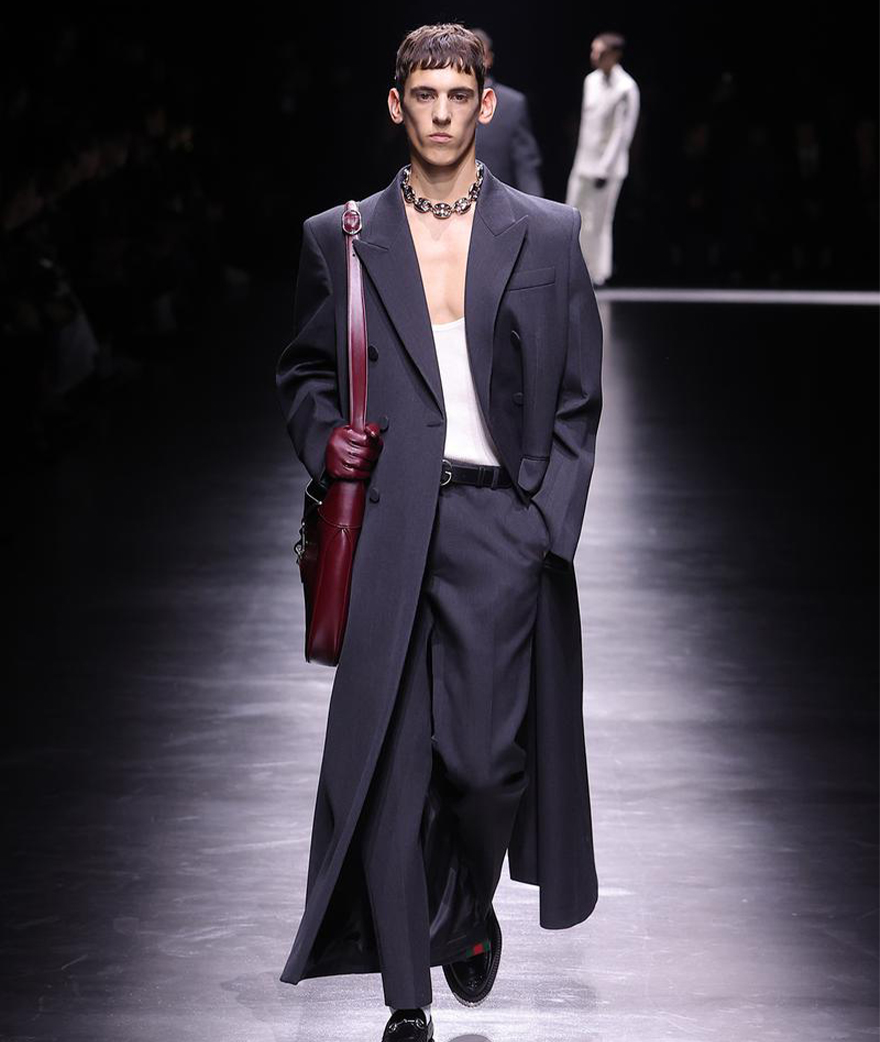 This winter collection designed by Sabato de Sarno also contains more statement pieces, such as these long coats with straight lines and emphasized shoulders, which brush the floor with every step you take. Featuring a long slit at the back, they can be worn with wide-leg pants in a similar color and a white tank top enhanced with the famous tie.
