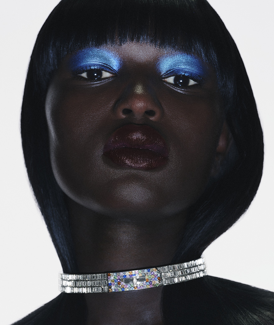 Pour ce nouveau défilé, Valérie Messika imagine un second volet à sa collection Midnight Sun, sortie l’an passé. Midnight Sun, Opus II est une célébration des soirées festives, passées à danser sans se préoccuper du lendemain. Les premières lueurs de l’aube se retrouvent dans des éclats de turquoise, parsemés ici et là, au détour d’un bijou de tête ou d’un collier à trois rangs. Comme sculpté au ras du cou, la courbe du collier White Midnight Sun mime un croissant de lune illuminant ces nuits sans fin.
