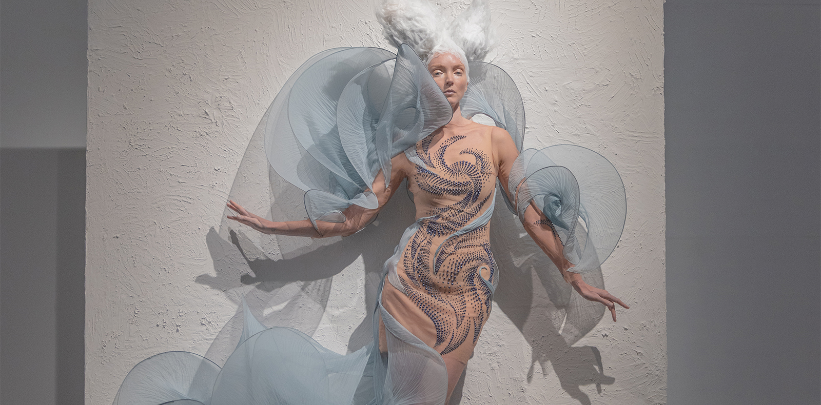 Dans un entrepôt vide, ses dernières créations se retrouvent ainsi sur des cimaises, portées par des mannequins en lévitation au sein de cadres en ciment. Déambulant de murs en murs, les invités découvrent avec stupéfaction ces créatures oniriques qui se meuvent avec grâce, tournant la tête au gré des passages ou arquant leurs bras pour dévoiler un peu plus de leur tenue.