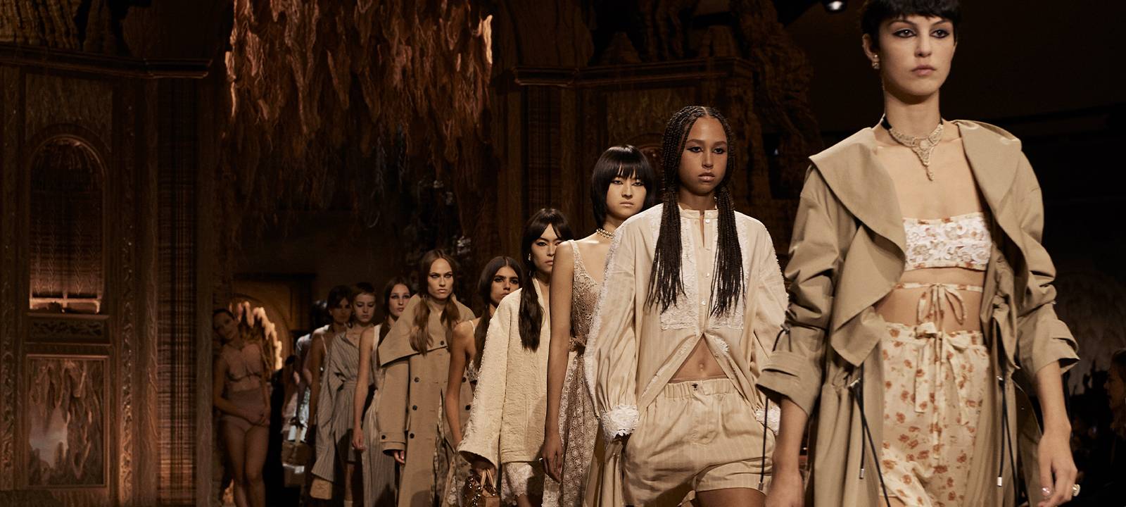 Et, comme pour chaque présentation, la scénographie est spécialement imaginée par une artiste invitée. Si, la saison passée Maria Grazia Chiuri, directrice artistique des collections féminines depuis 2017, faisait appel à l’artiste italienne Elena Bellantoni, cette fois-ci, c’est au tour de l’artiste indienne Shakuntala Kulkarni de donner sa vision de la féminité.