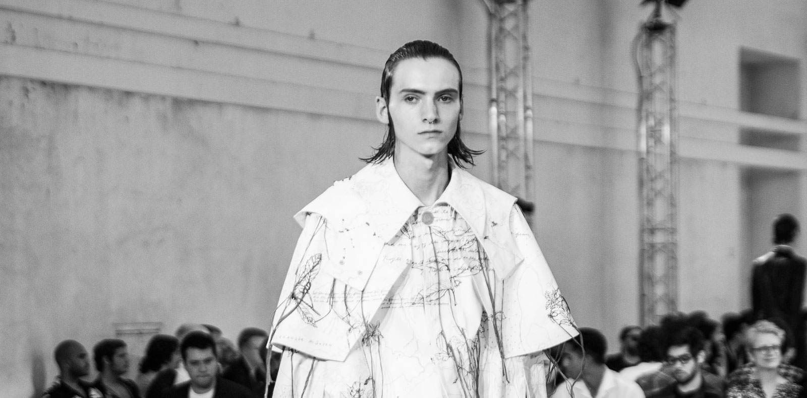 Beaucoup de monochromes gris et marrons, et un final de huit looks colorés – bleus, rouges, jaunes et verts. Seule excentricité majeure, des pièces ornées de dessins stylisés de carottes, poulets, citrons, aubergines et bouteilles de champagne sur une chemise, un large costume ou un pantalon fluide. On retrouve les larges costumes à double boutonnage “poinçonnés”, quelques larges panchos ou vestes en mailles (dont une tricotés à motifs amérindiens), des trenchs courts ou longs et élégants, ainsi que des blousons aviateurs ou des bombers, offrant une large variété de pardessus masculins. Les pantalons sont droits ou baggys, certains d’une grande fluidité ou alors en cuir. Autres détails, des chemises à liens coulissants qui offrent un nouveau style à la silhouette. Devant tant de diversité et d’harmonie, une question se pose : cette saison, Virgil Abloh aurait-il réussi à constituer le vestiaire masculin idéal ?